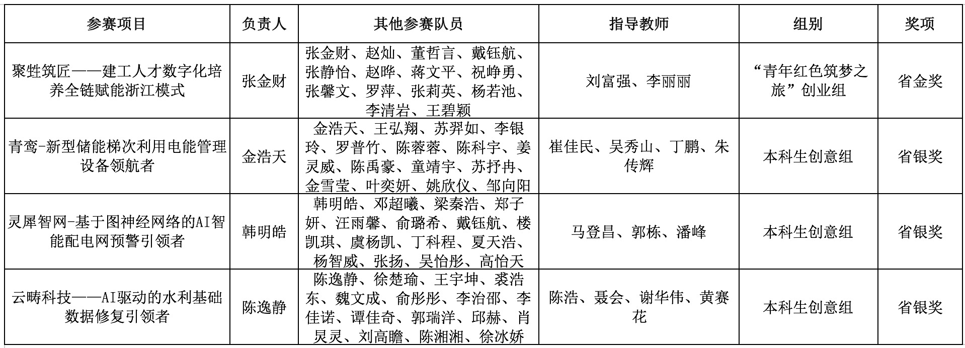 决赛现场,我校4支入围团队沉着应战,出色发挥,经过项目团队陈述、评委提问、选手作答、导师推荐等环节,《聚甡筑匠——建工人才数字化培养全链赋能浙江模式》项目斩获金奖,《青鸾-新型储能梯次利用电能管理设备领航者》《灵犀智网-基于图神经网络的AI智能配电网预警引领者》《云畴科技——AI驱动的水利基础数据修复引领者》获得银奖。