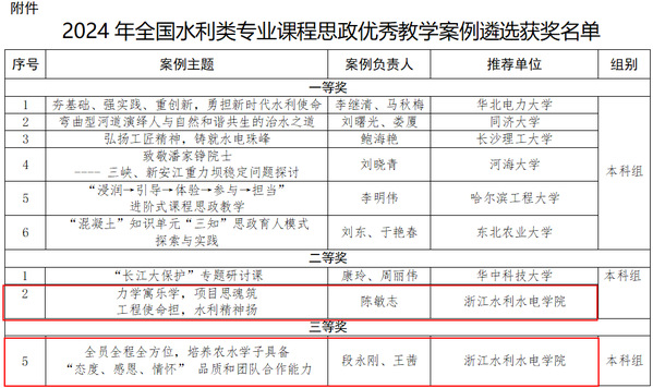 近日,中国水利教育协会发布了《关于公布2024年全国水利类专业课程思政优秀教学案例遴选结果的通知》,我校建工学院陈敏志老师报送的“力学寓乐学,项目思魂筑,工程使命担,水利精神扬”-《材料力学》课程思政教学案例荣获二等奖;水利学院段永刚老师报送的“全员全程全方位,培养农水学子具备‘态度、感恩、情怀’品质和团队合作能力”-《灌溉排水工程学》课程思政教学案例荣获三等奖。