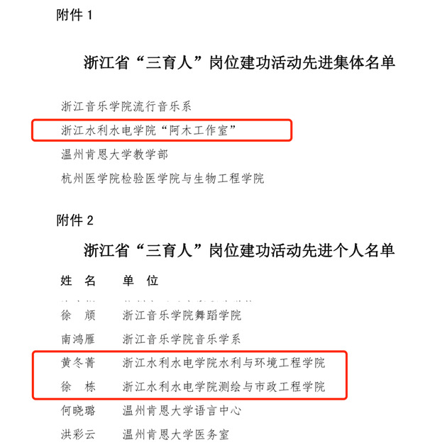近日,浙江省教育工会发布《关于浙江省“三育人”岗位建功活动先进集体和先进个人的通报》,我校 “阿木工作室”获评浙江省“三育人”岗位建功活动先进集体,水环学院黄冬菁老师、测市学院徐栋老师获评浙江省“三育人”岗位建功活动先进个人。