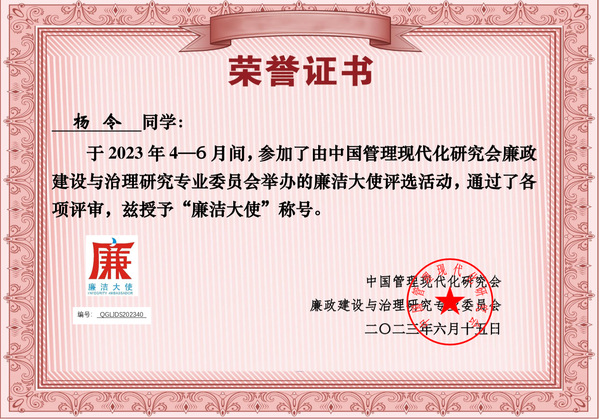 近日,由中国管理现代化研究会廉政分会、全国大学生廉洁社团网络等联合主办的2023年“廉洁大使”评选活动落下帷幕,我校廉政文化社社长杨令同学被授予2023年全国大学生“廉洁大使”荣誉称号。本次评选活动在全国范围内共评选产生40位大学生“廉洁大使”。