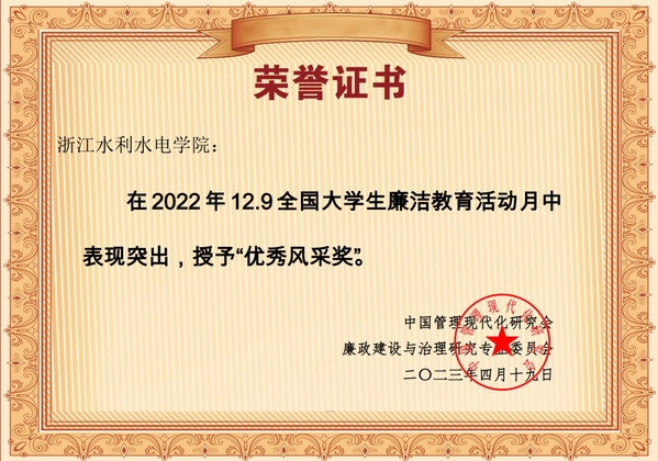 我校廉政文化社由校纪检监察室、校团委、马克思主义学院负责日常管理指导。杨令同学担任社长期间,致力于宣传廉洁文化,精心组织主题宣誓、专题讲座、实践调研、12.9大学生廉洁教育月等系列活动,普及廉洁知识,传播廉洁价值,赓续廉洁基因,增强大学生对廉洁文化、廉洁水院的认知度、认同感,充分发挥了高校廉洁社团在大学生廉洁教育中的积极作用。今年4月,杨令同学带领廉政文化社在“2022年12·9全国大学生廉洁教育月活动”评选中获评“优秀风采奖”,是唯一获此类别荣誉的浙江省高校学生社团;7月,杨令同学带领社团骨干参加2023全国大学生廉洁大使夏令营并顺利结业。